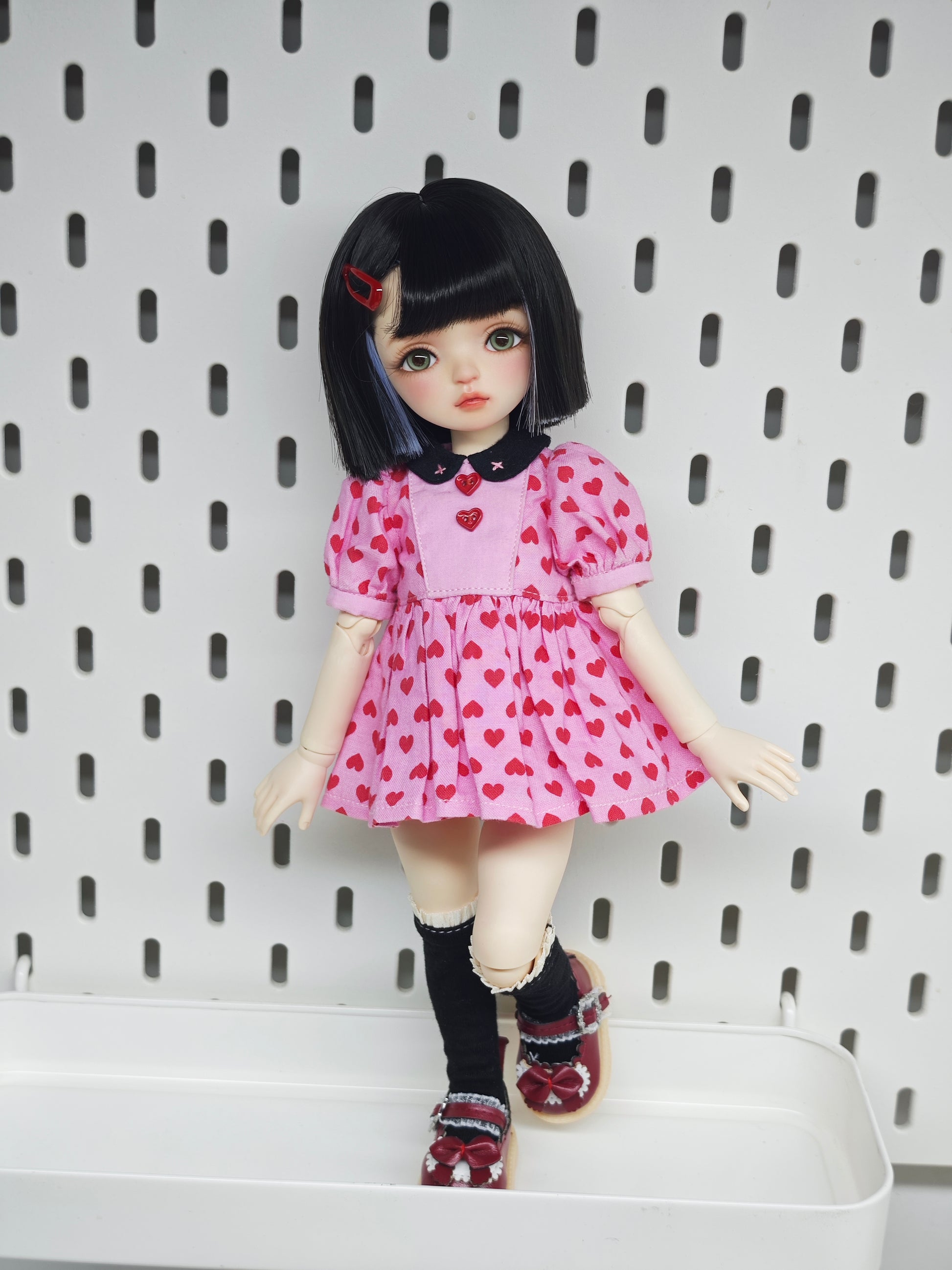 - Wig, skirt, socks, shoes and glass eyes as shown in photo.